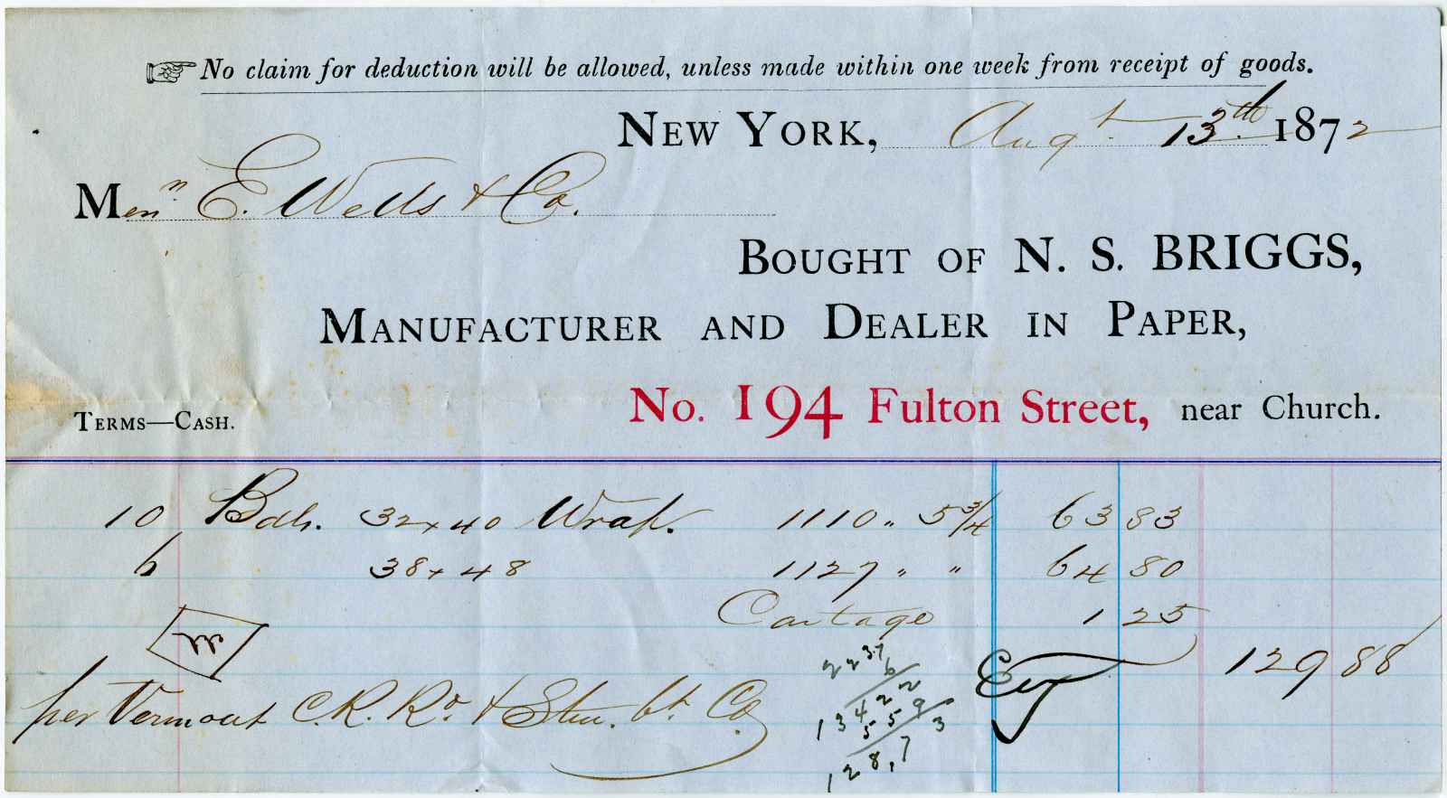 invoice; Briggs, N. S. - Paper Sales - 194 Fulton St. N.Y.