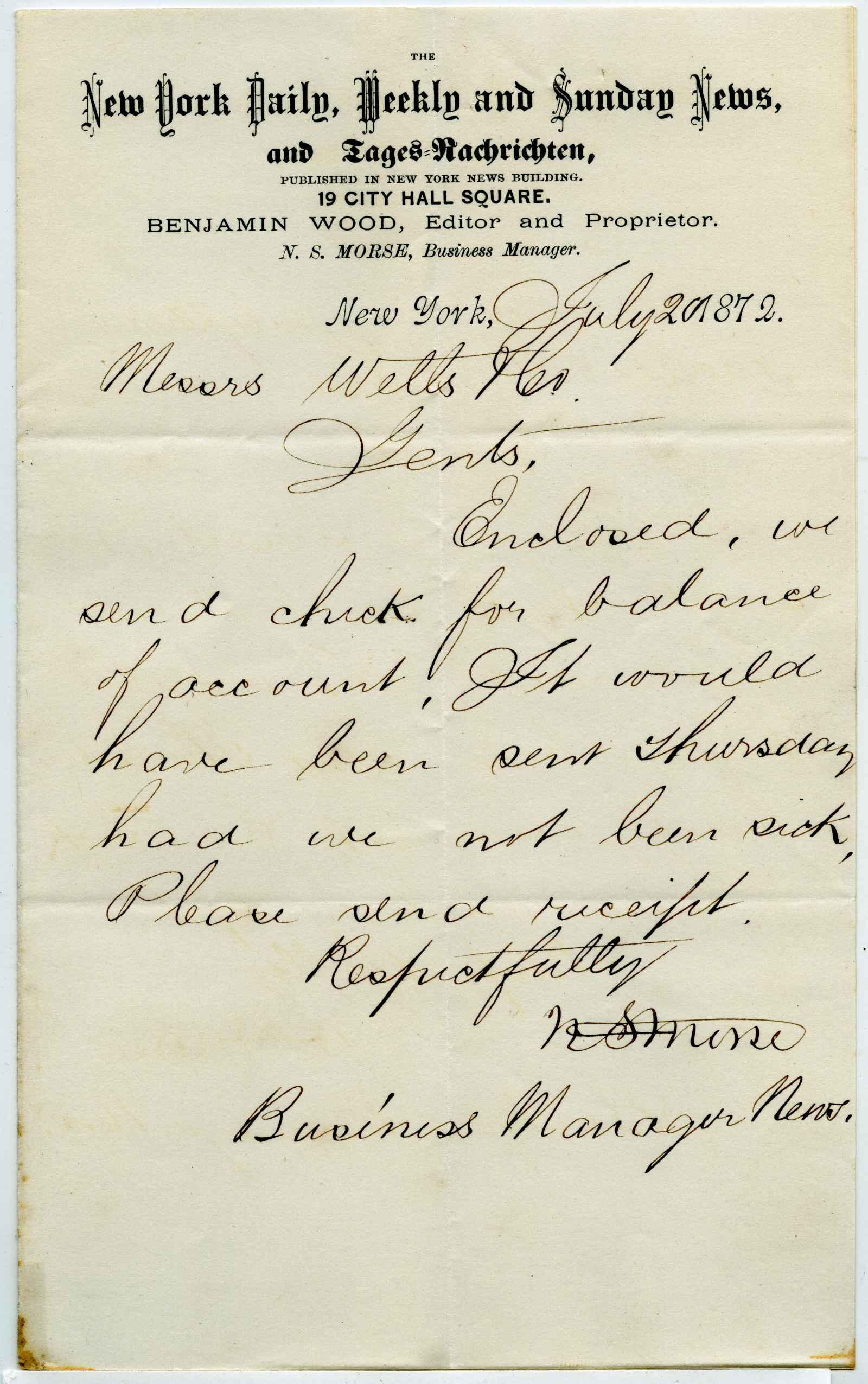 incoming correspondence to the papermaking company of Elisha Wells - circa 1870