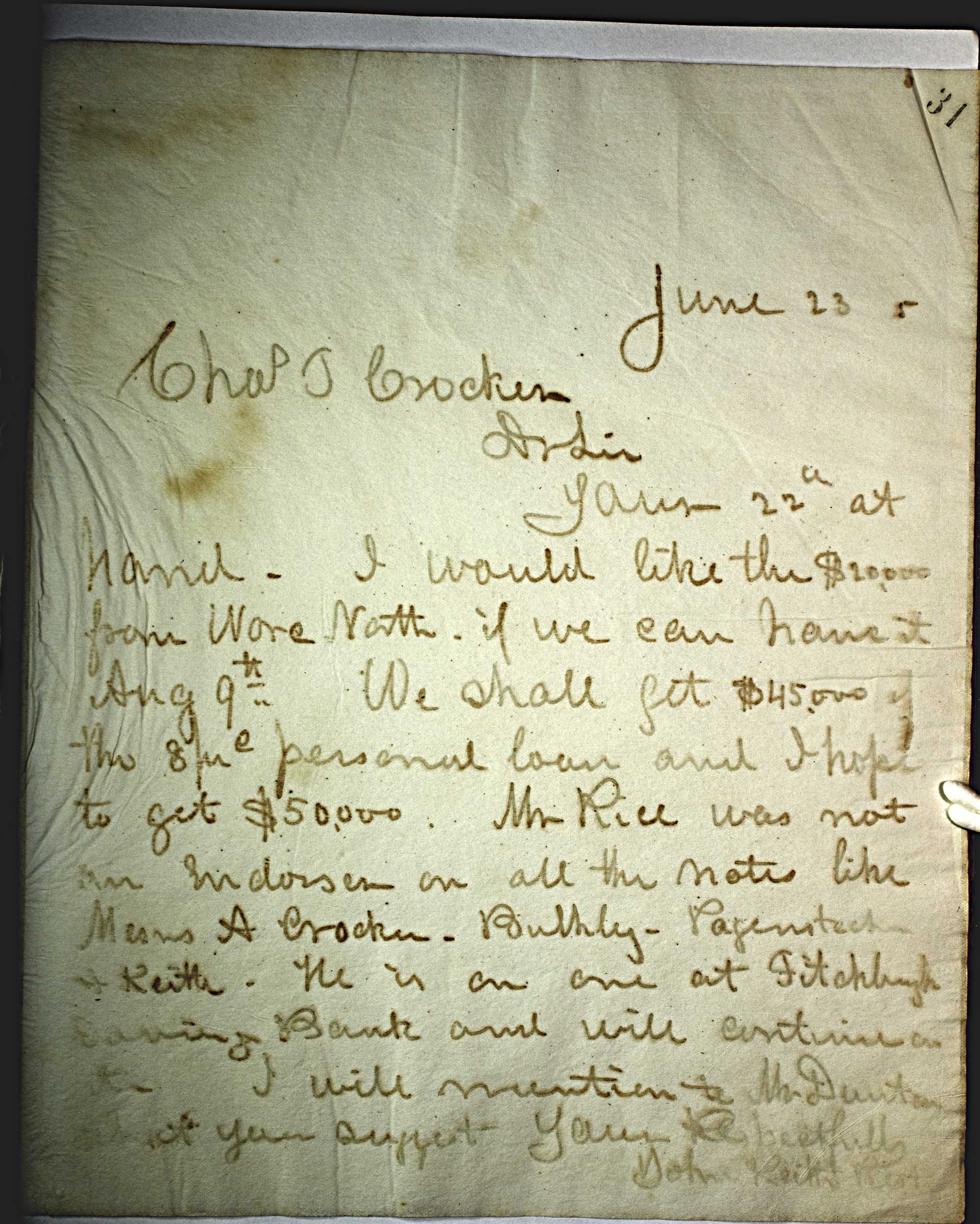 June 23 5 [1875] -- Charles T Crocker -- Dear Sir --  Your 22nd at hand. I would like the $20,000 from Ware North. If we can have it Aug 9th . We shall get $45,000 if the 8 -- % -- personal loan and I hope to get $50,000 . Mr Rice was not an endorser on the notes like Messers Crocker - Bulkley - Pagenstecher & Keith. He is on one at Fitchburg Savings Bank and will continue on it. I will mention to Mr Dunton what you suggest. -- Yours Respectfully -- John Keith Prest --