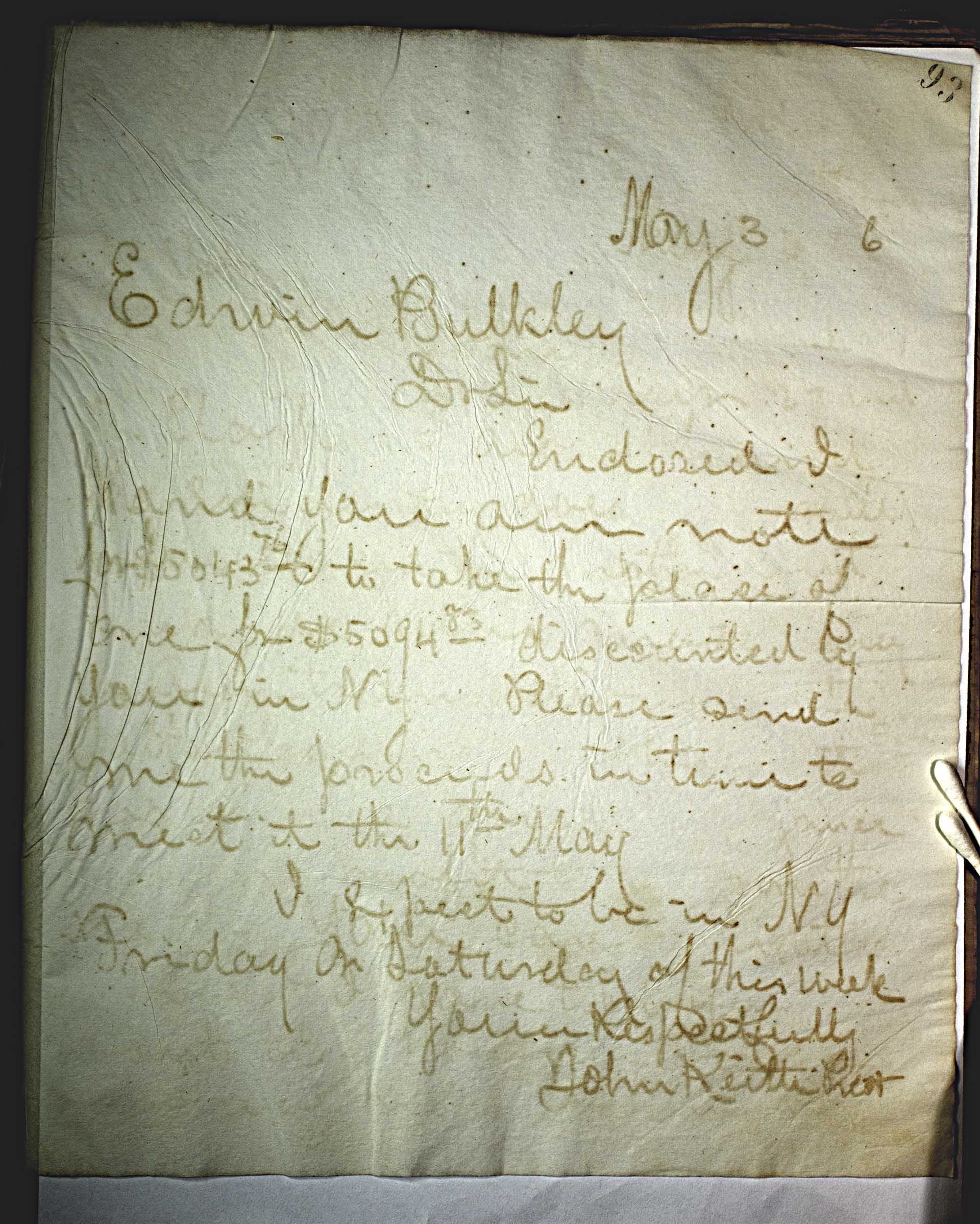 May 3 6 [1876] -- Edwin Bulkley -- Dr Sir, -- Endorsed I hand you our note for $5043 -- 76 -- to take the place of one for 5094 -- 83 -- discounted by you in NY. Please send me the proceeds in time to meet it the 11th May. -- I expect to be in NY Friday or Saturday of this week. -- Yours Respectfully -- John Keith Prest --