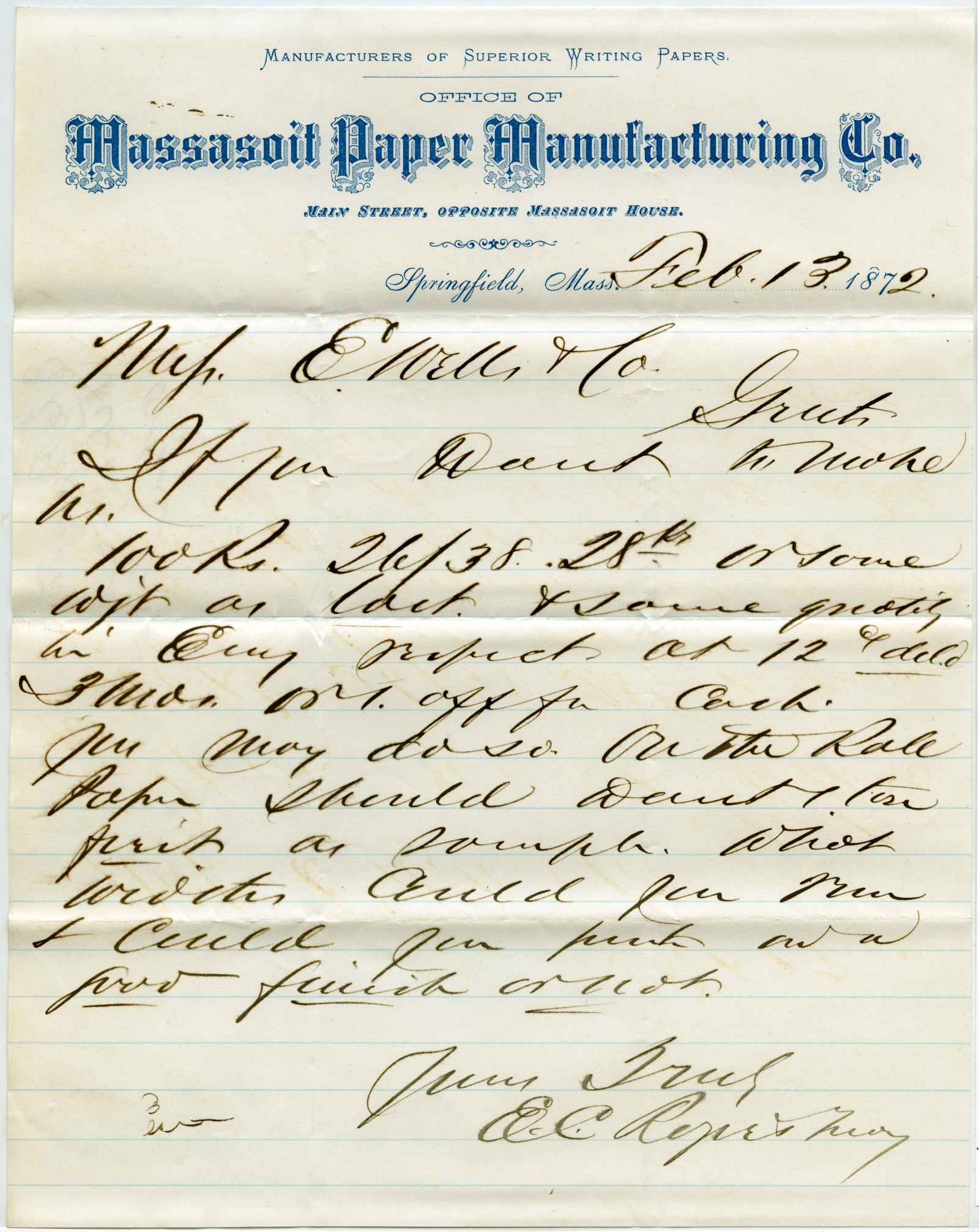 letter; Massasoit Paper Manufacturing Co. - Springfield, Ma.