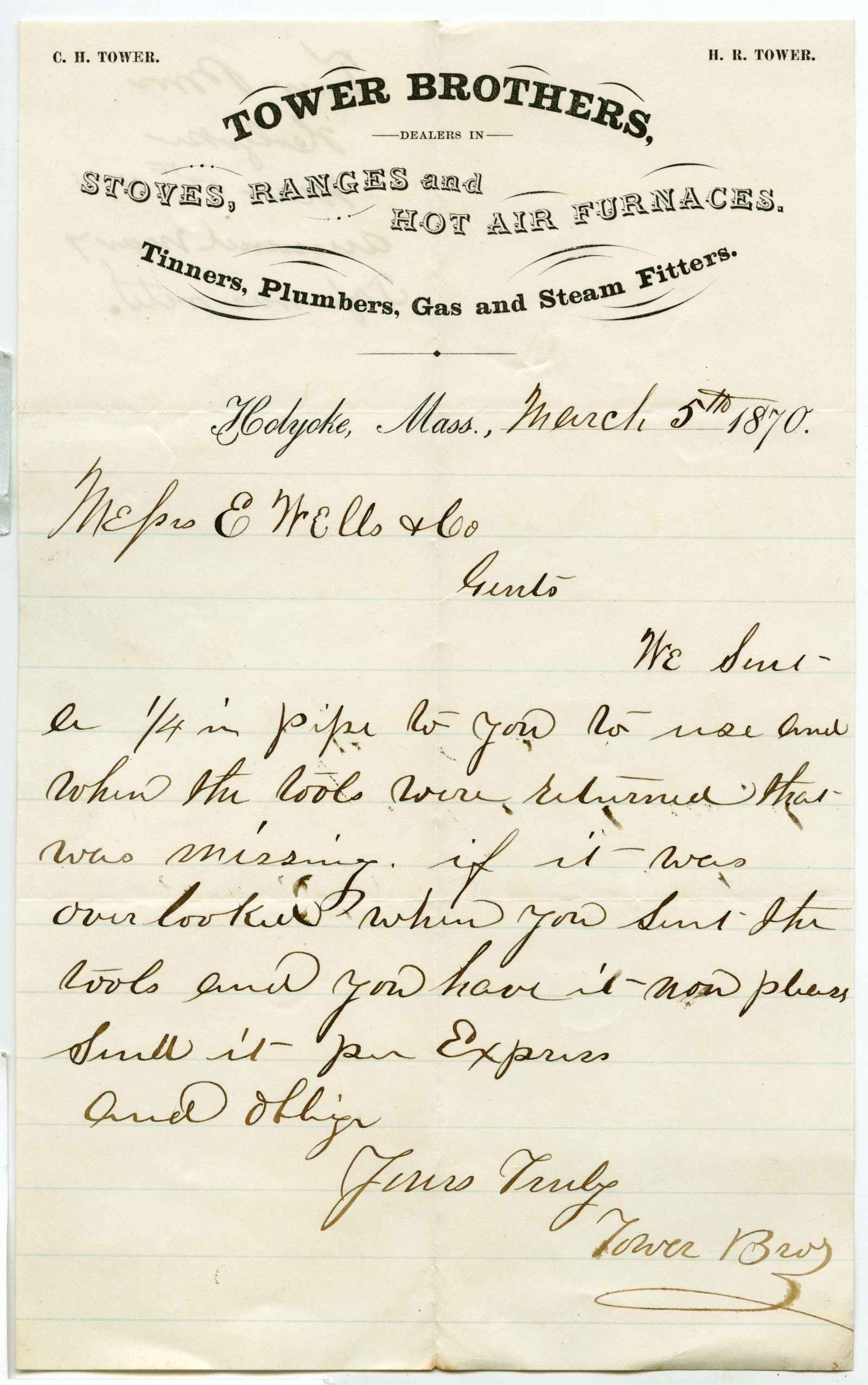 letter; Tower Bros. - Stoves, Hot Air Furnaces, House Finishing Goods - Holyoke, Ma.