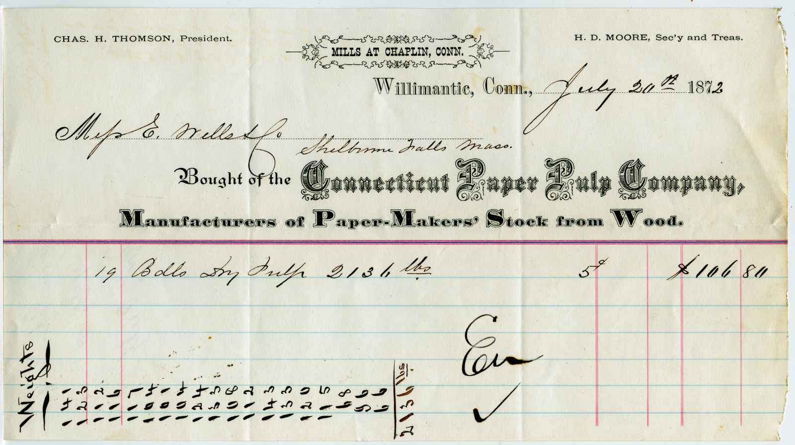 invoice; Connecticut Paper Pulp Company - Paper Maker's Stock From Wood - Willimantic, Ct.