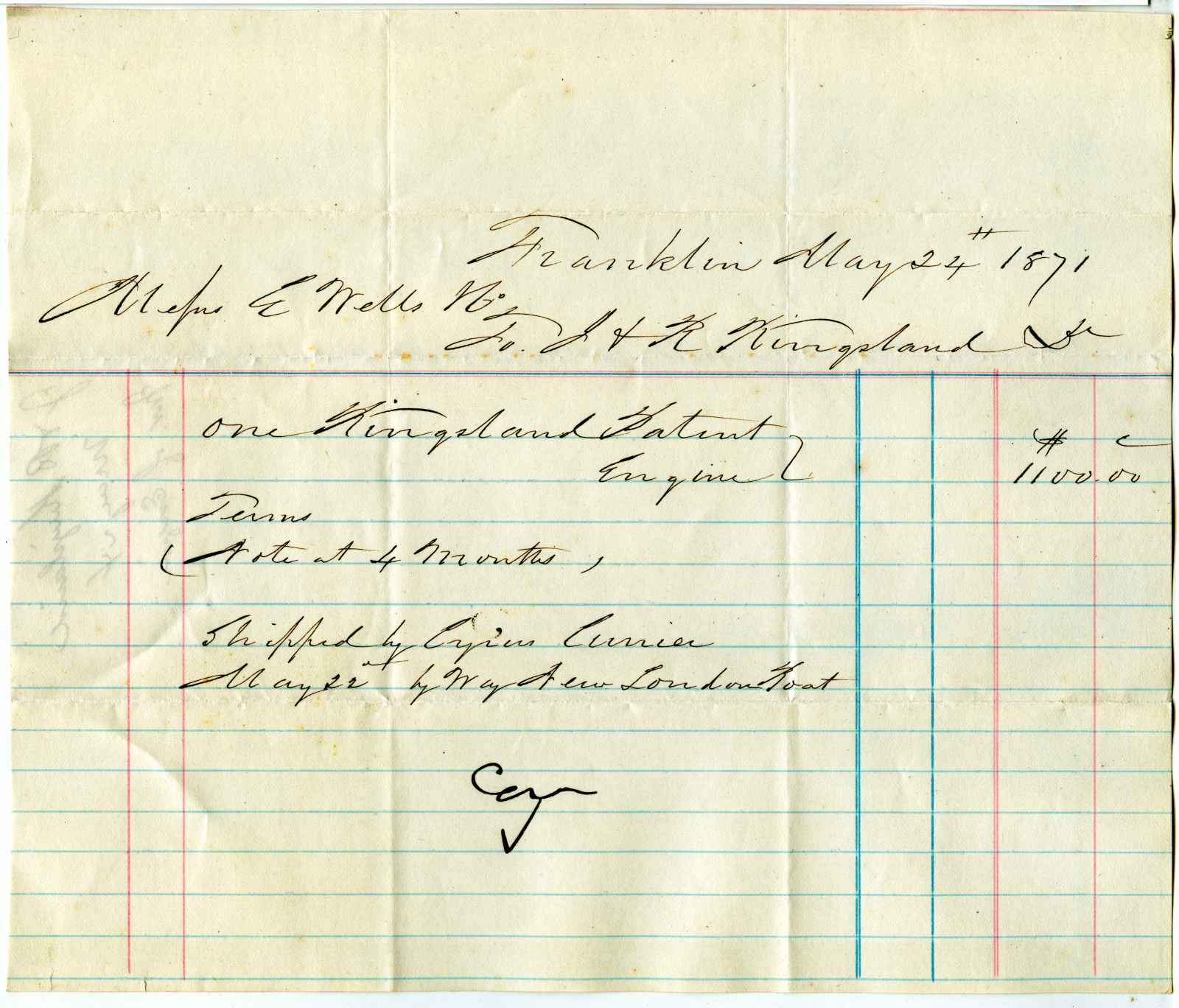 invoice; Kingsland, J. & R - purchase of Patent Engine - Franklin, N. J.