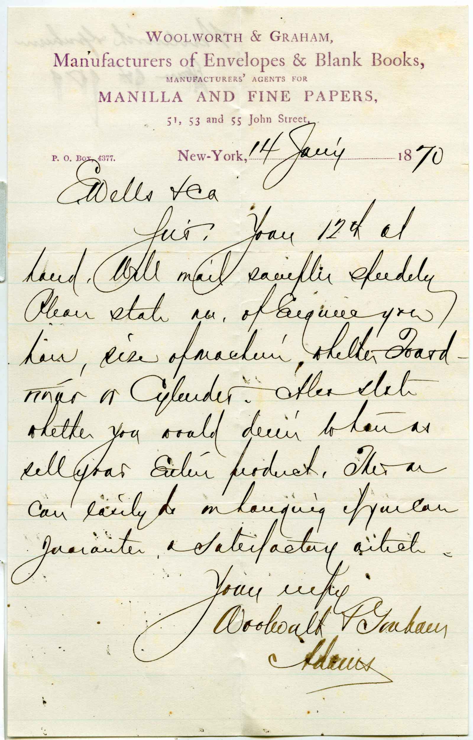 letter; Woolworth & Graham - Manufacturers of Envelopes and Blank Books - N.Y.