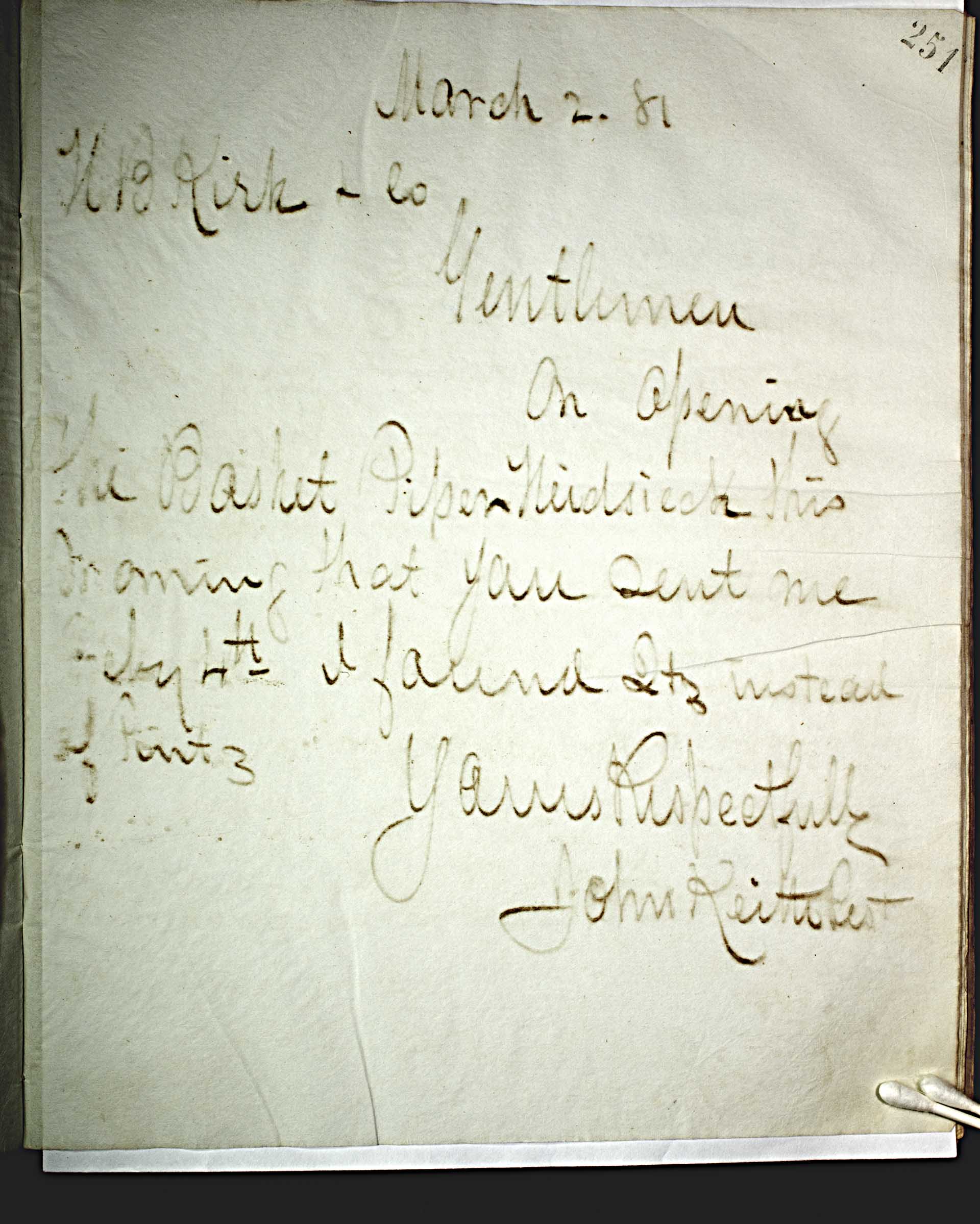 March 2, 81 [1881] -- N. B. Kirk & Co. -- Gentlemen, -- On opening the Basket Piper [Heiderich] this morning that you sent me Feby 4th I found Qtz. instead of Pints Yours Respectfully, -- John Keith --