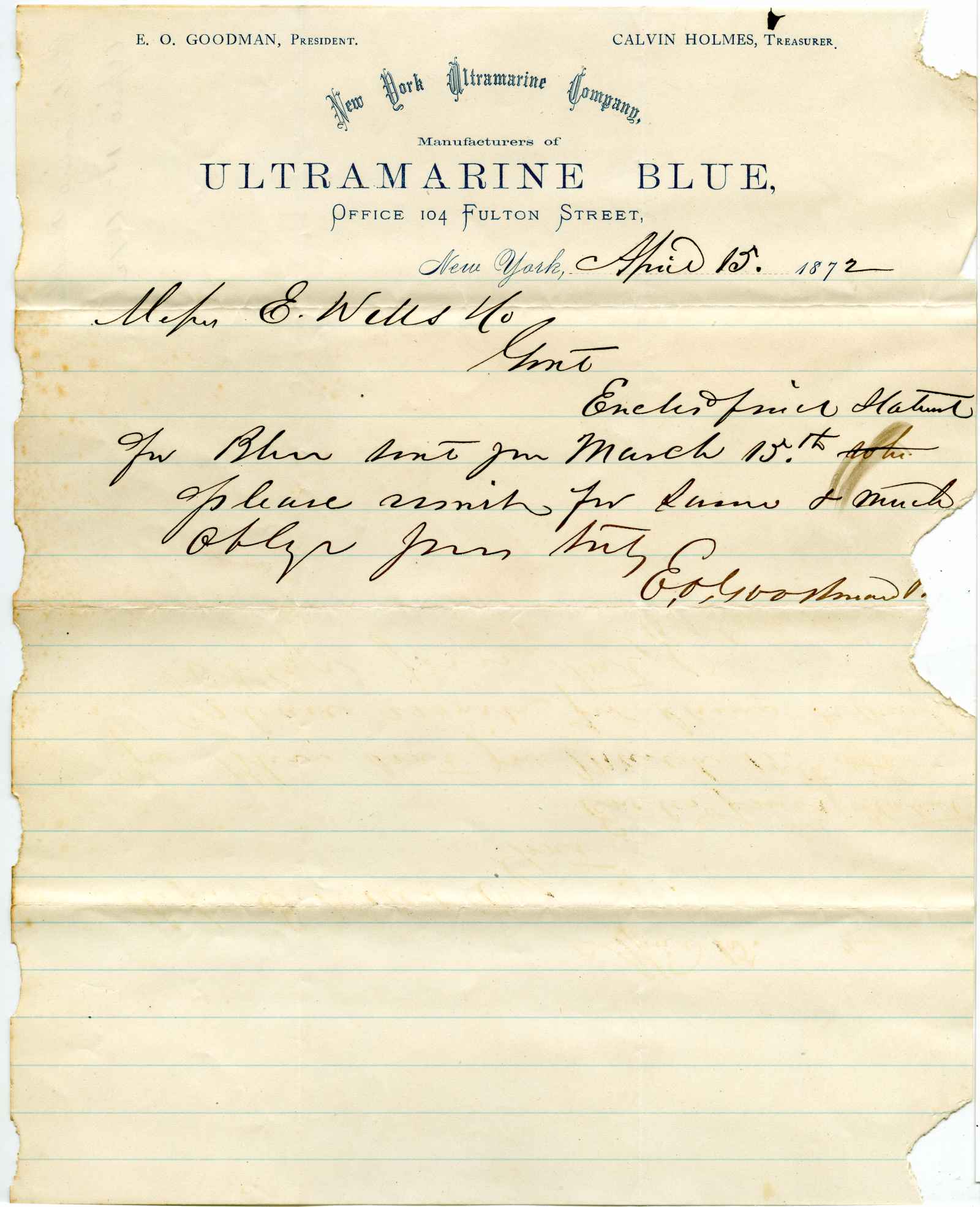 letter; New York Ultramarine Company - Manufacturers of Ultramarine Blue - N.Y.