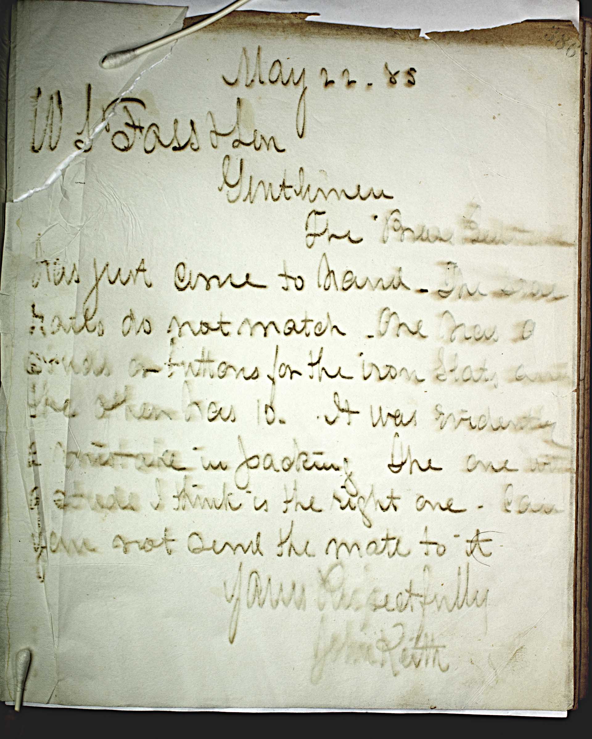 May 22. 85 [1885] -- W. S. Foss & Son -- Gentlemen, -- The brass bedstand has just come to hand. The side rails do not match. One has [50] [studs] or buttons for the iron slats and one of them has 10. It was evidently a mistake in packing. The one with the studs I think is the right one. Can you not send the mate to it. -- Yours Respectfully -- John Keith -- --