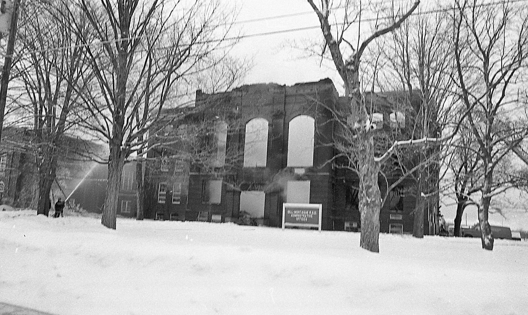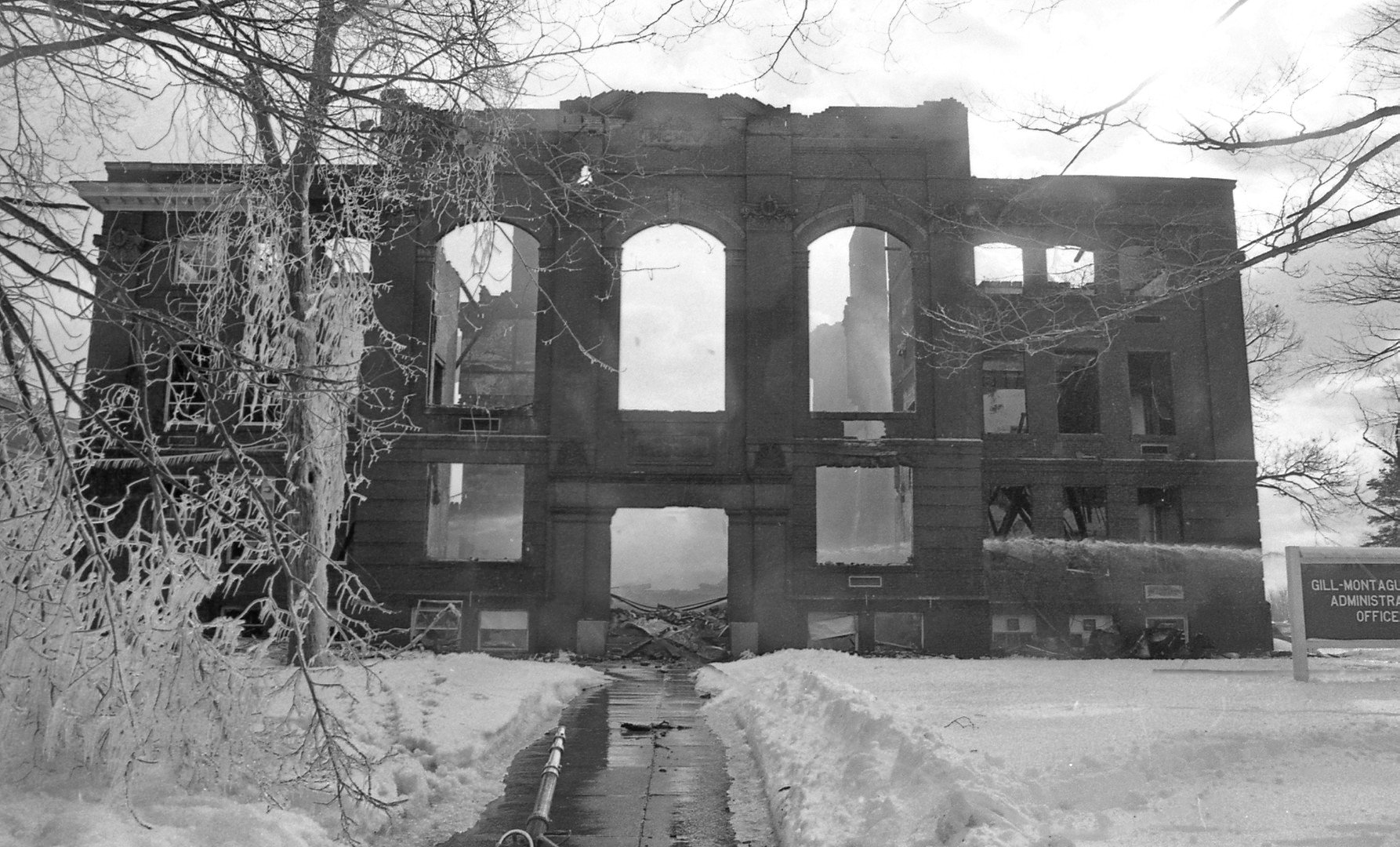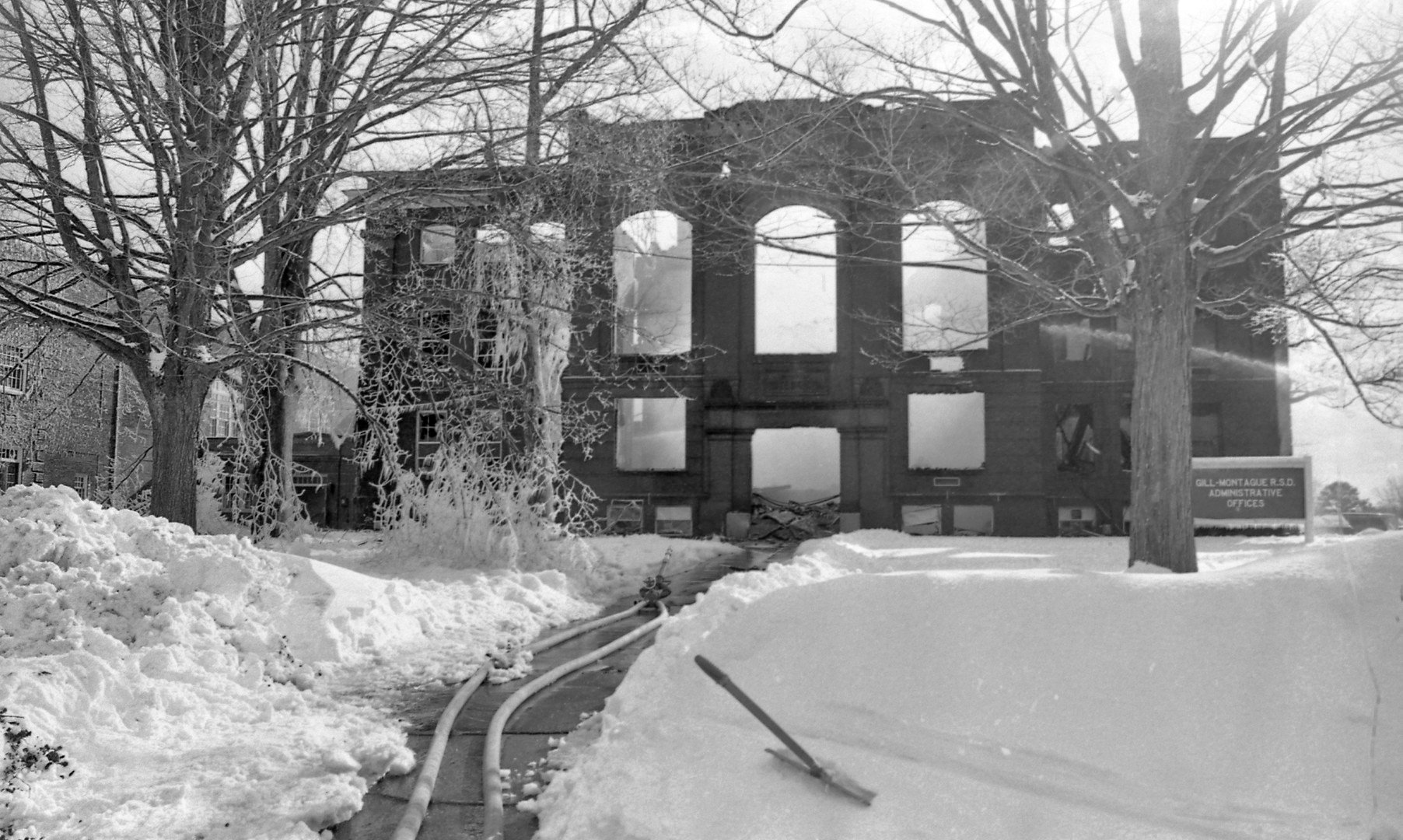 The Sheffield Middle School in Turners Falls, Massachusetts is destroyed by fire on a below-zero, morning, January 23, 1987.