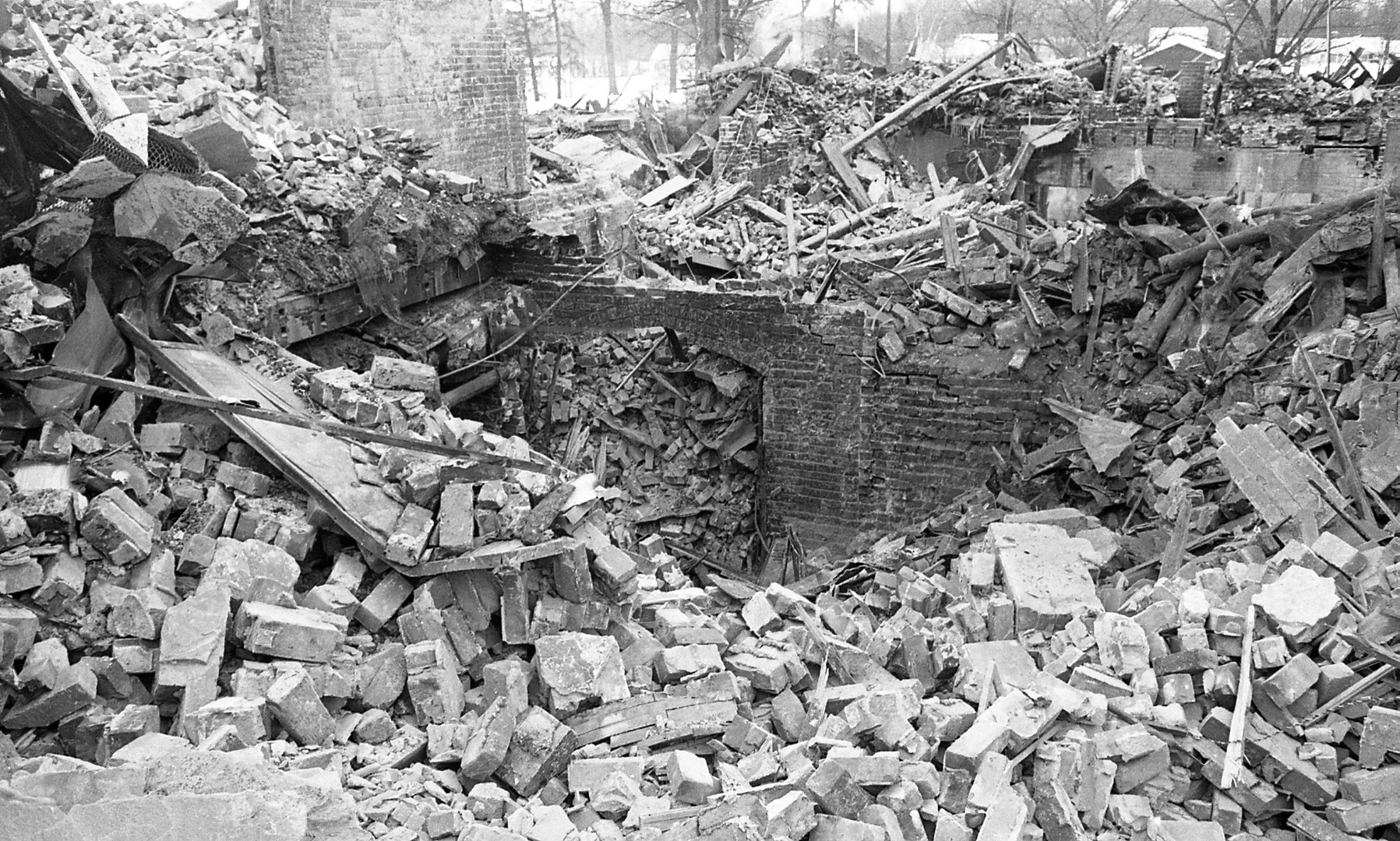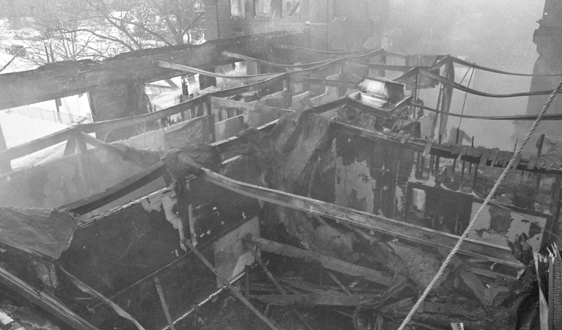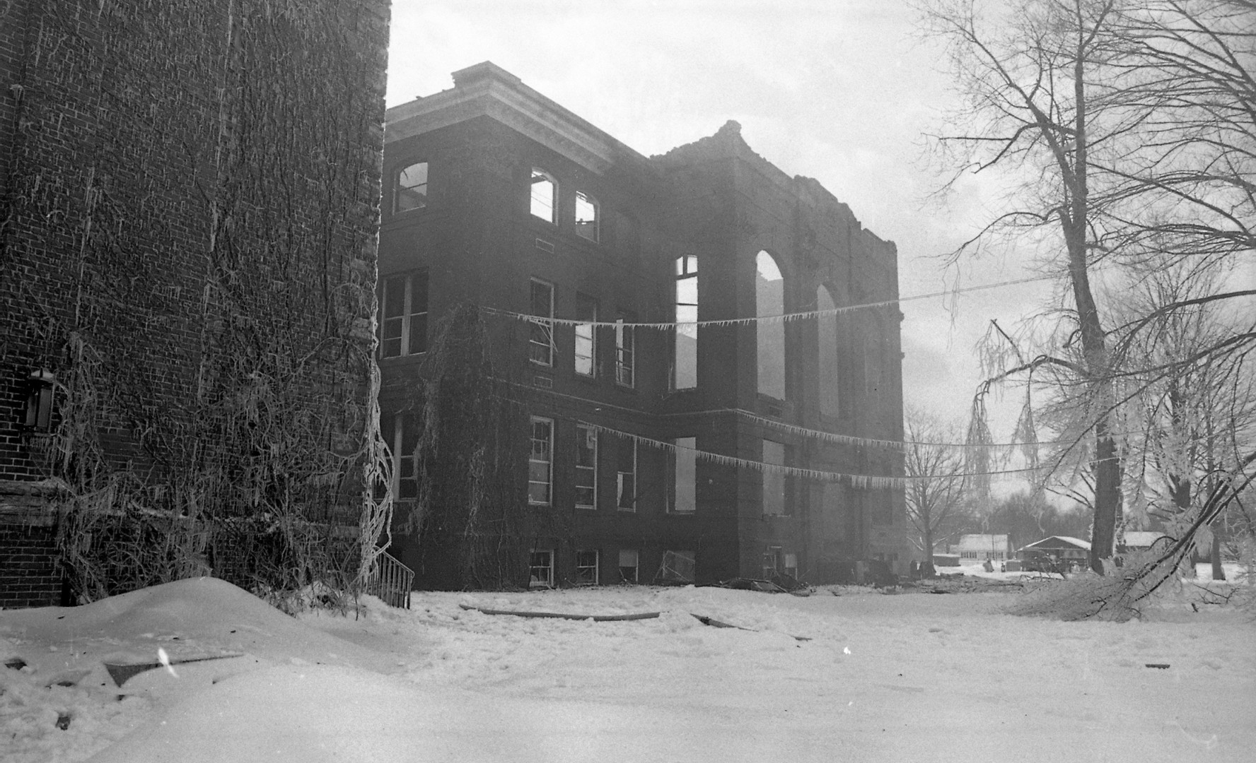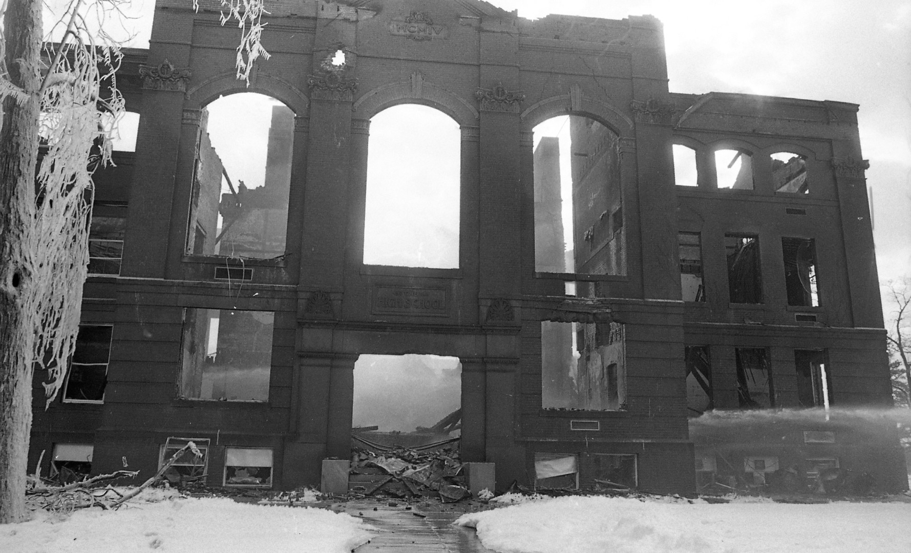 The Sheffield Middle School in Turners Falls, Massachusetts is destroyed by fire on a below-zero, morning, January 23, 1987.