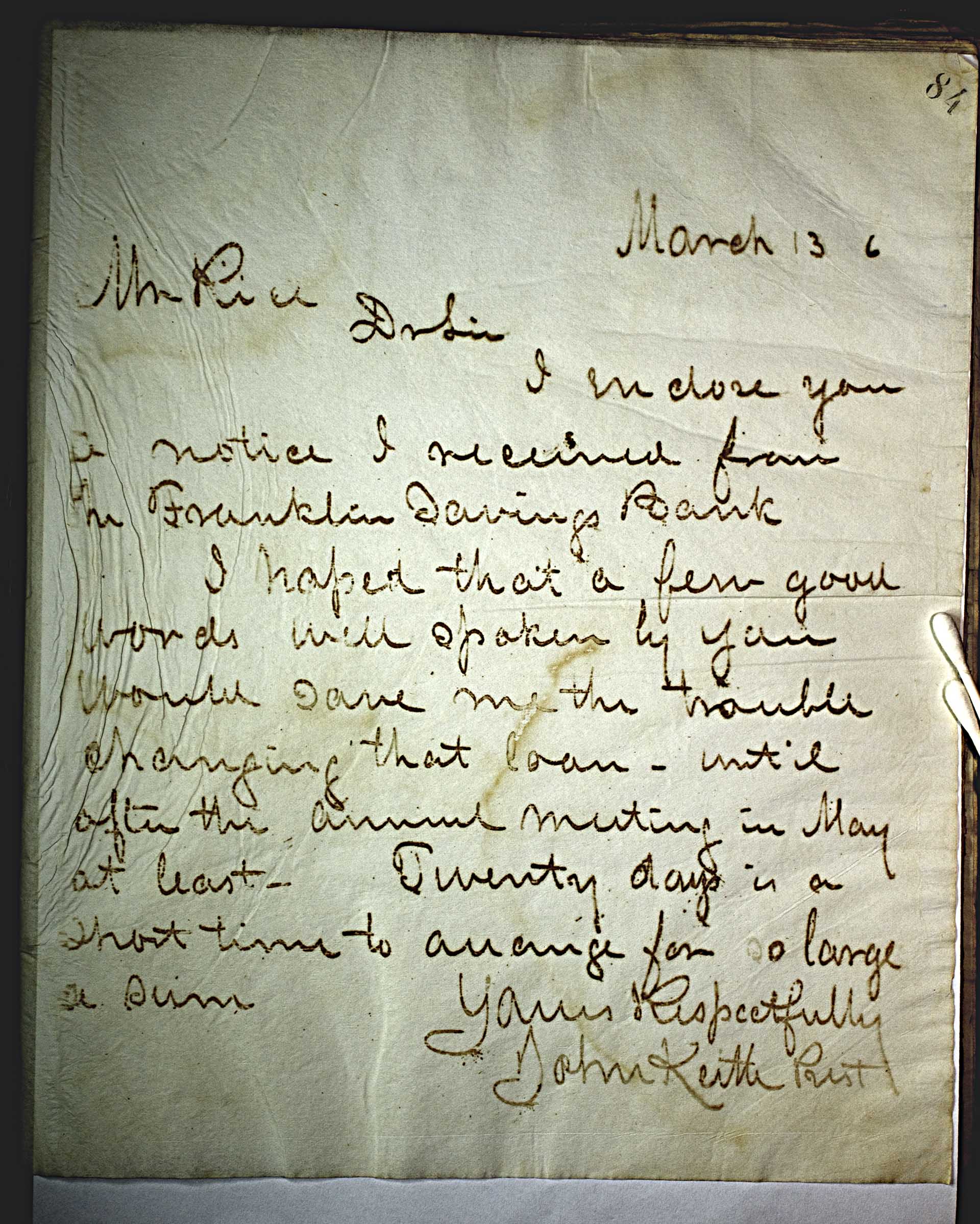 March 13 6 [1876] -- Mr Rice, -- Dr Sir, -- I enclose you a notice I received from the Franklin Savings Bank. -- I hoped that a few good words well spoken by you would save me the trouble changing that loan until after the annual meeting in May at least. Twenty days is a short time to arrange for a large sum Yours Respectfully -- John Keith Prest --