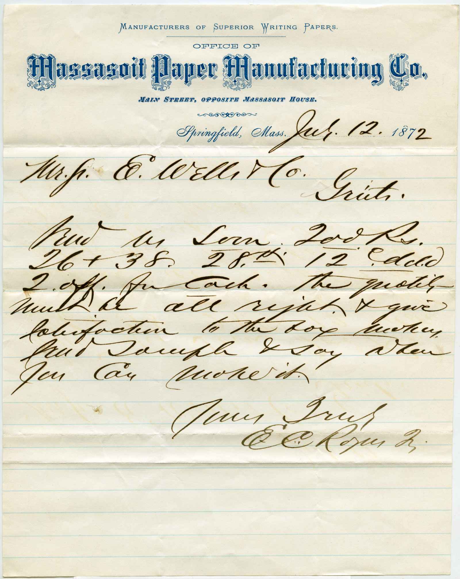 letter; Massasoit Paper Manufacturing Co. - Order for paper - Springfield, Ma.