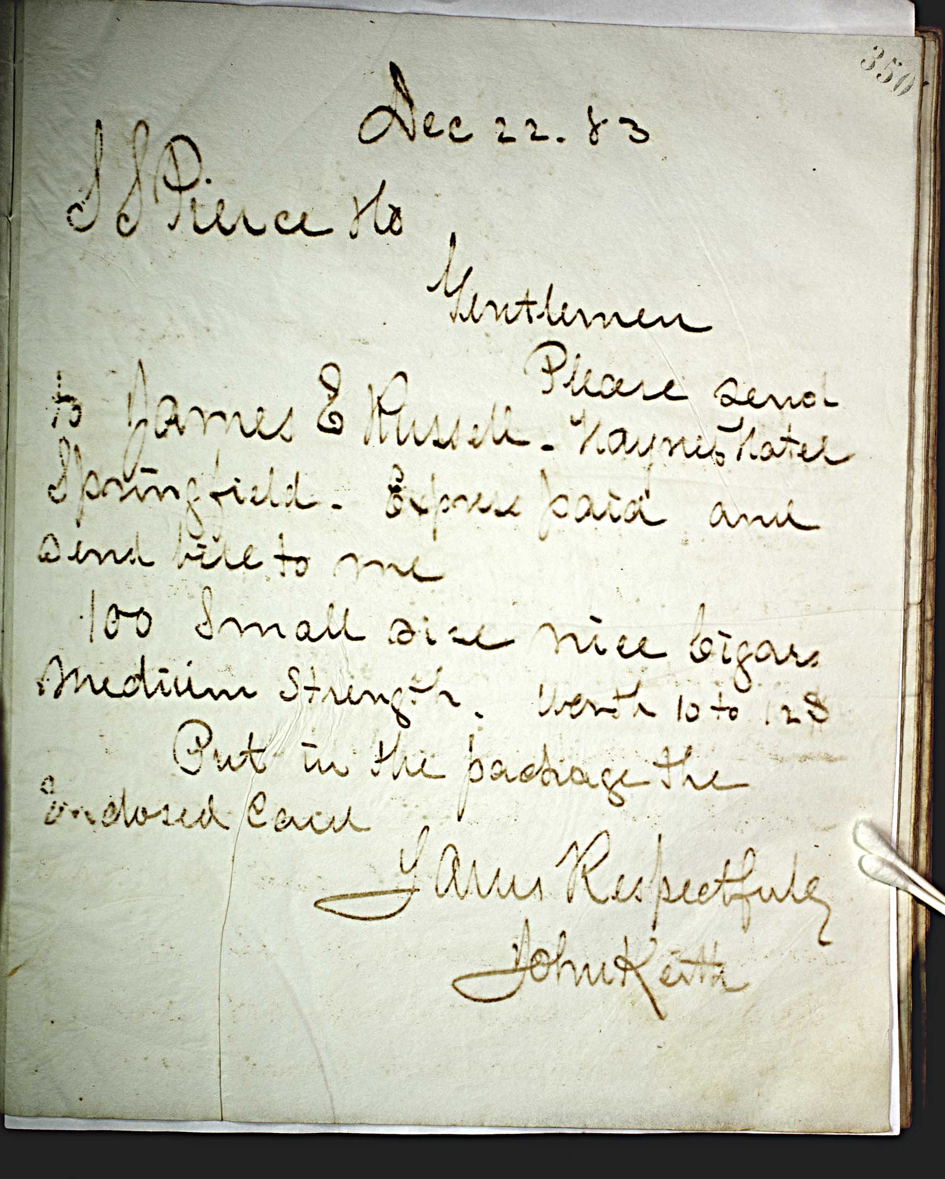 Dec. 22, 83 [1883] -- S. S. Pierce & Co. -- Gentlemen, -- Please send to James E Russell Haynes Hotel Springfield – Express paid and send bill to me, -- 100 small size nice cigars medium strength worth 10 to 12$. -- Put in the package the enclosed card. -- Yours Respectfully -- John Keith --