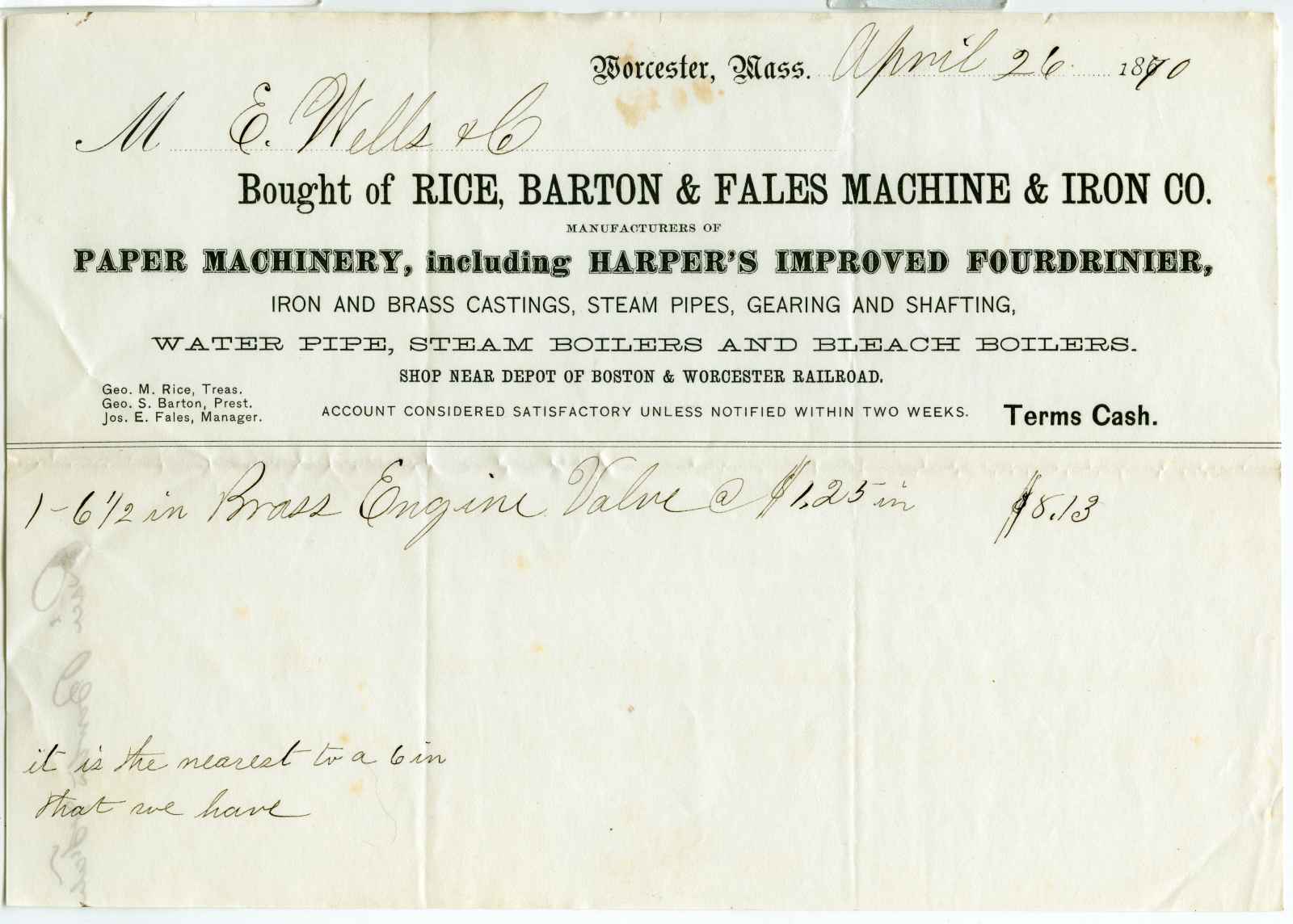 invoice; Rice, Barton & Fales - Machine & Iron Company - Worcester, Ma.