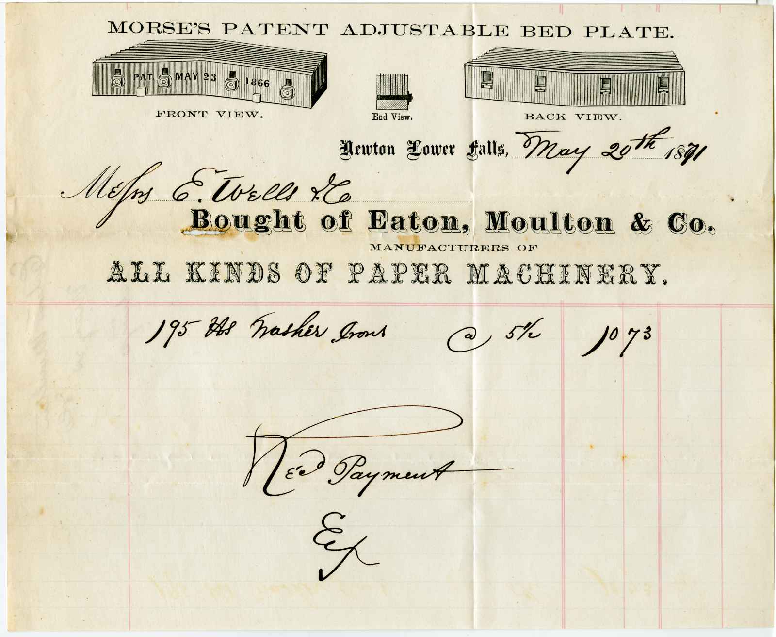 receipt; Eaton, Moulton & Co. - All kinds of paper machinery - Newton Lower Falls, Ma.
