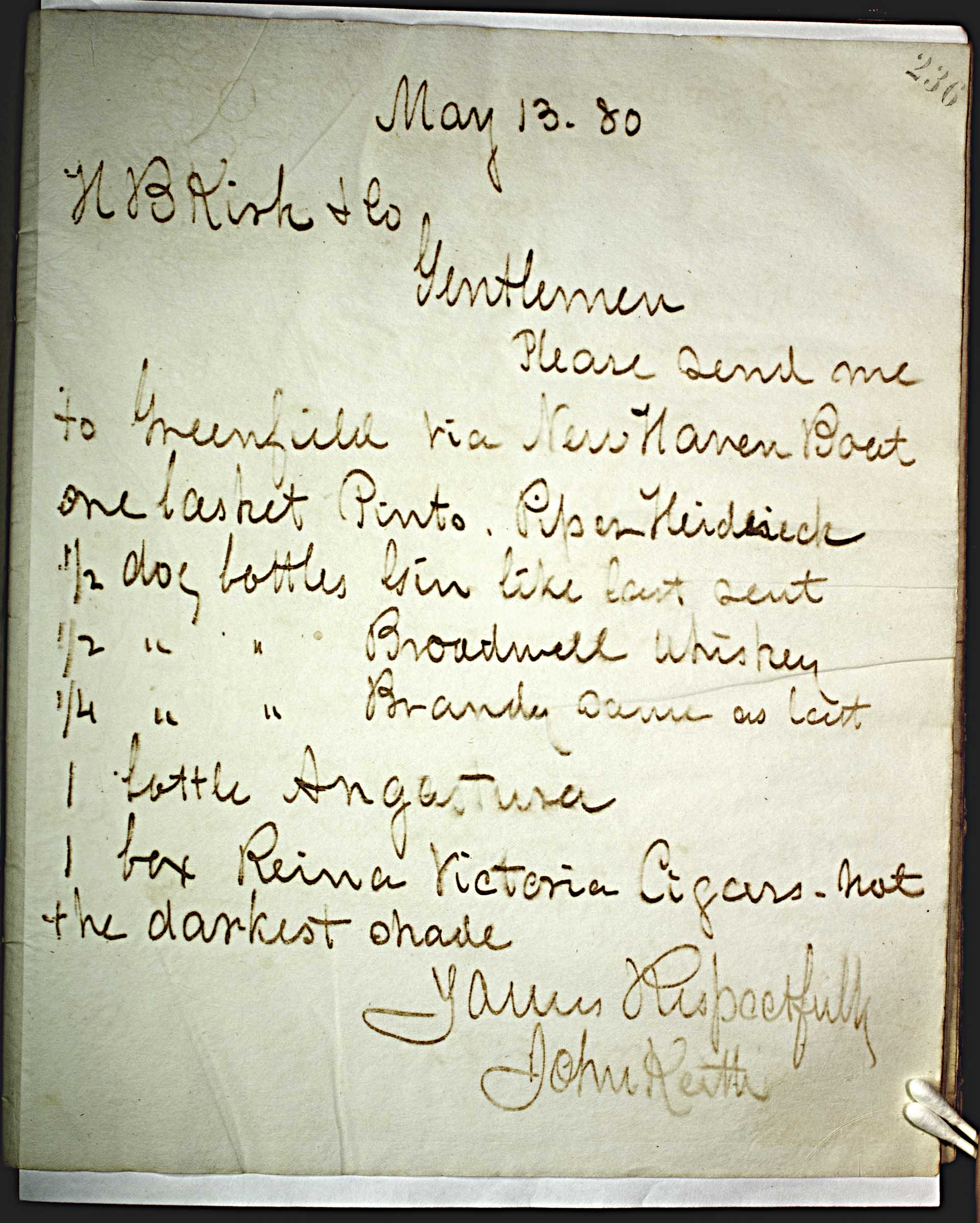 May 13, 80 [1880] -- N. B. Kirk & Co. -- Gentlemen, -- Please send me to Greenfield via New Haven Boat one basket Pinto Piper [Heiderich] -- ½ doz. bottles gin like last sent -- ½ “ “ Broadwell whiskey -- ¼ “ “ Brandy same as last -- 1 bottle Angustura -- 1 box Reina Victoria Cigars-not the darkest shade -- Yours Respectfully -- John Keith --