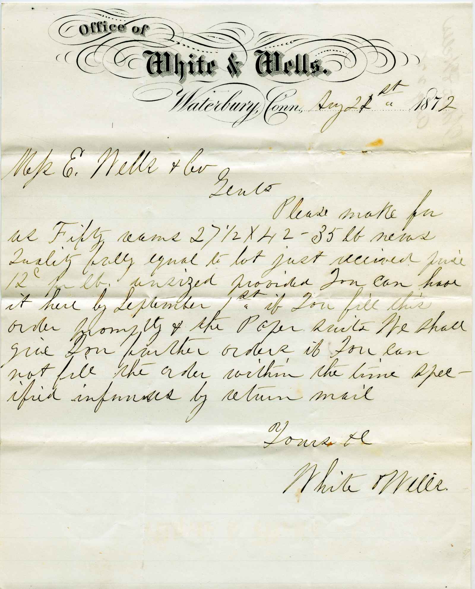 incoming correspondence to the papermaking company of Elisha Wells - circa 1870