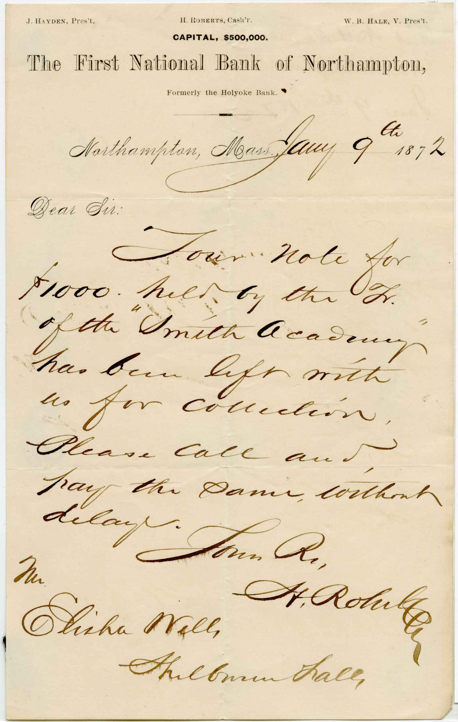 letter; First National Bank of Northampton - Smith Academy letters (3) - Northampton, Ma.