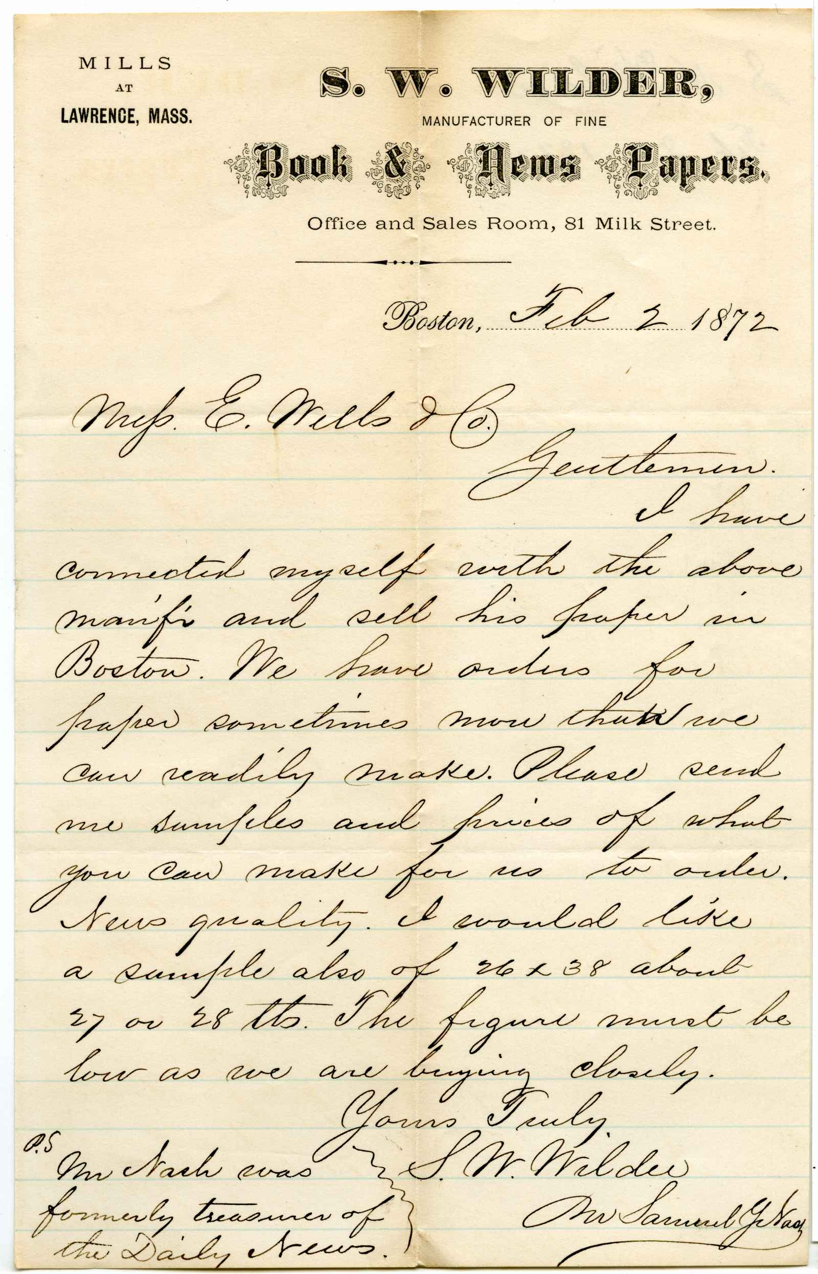 letter; Wilder, S. W. - Manufacturers of Book & Newspapers - Boston