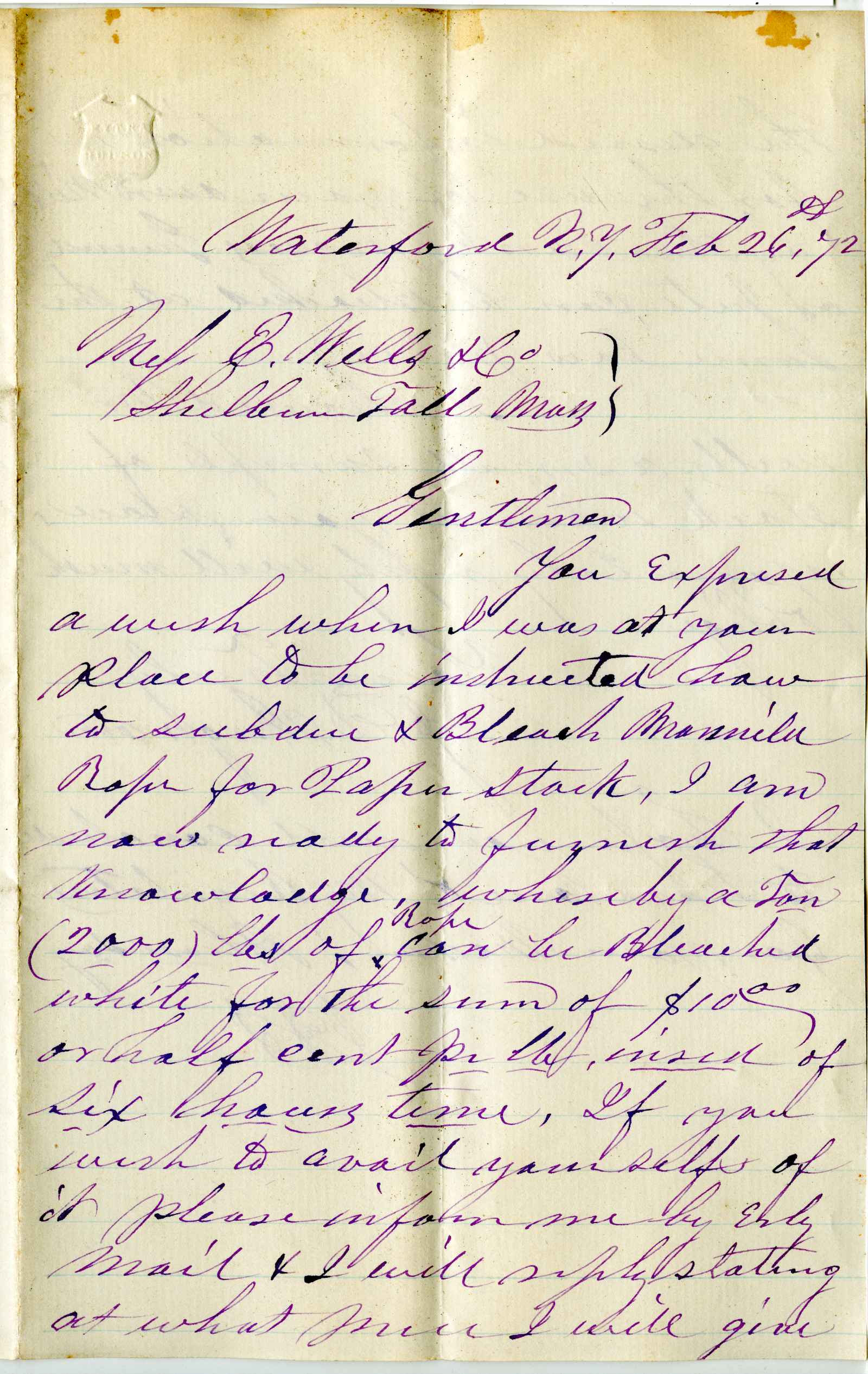 incoming correspondence to the papermaking company of Elisha Wells - circa 1870