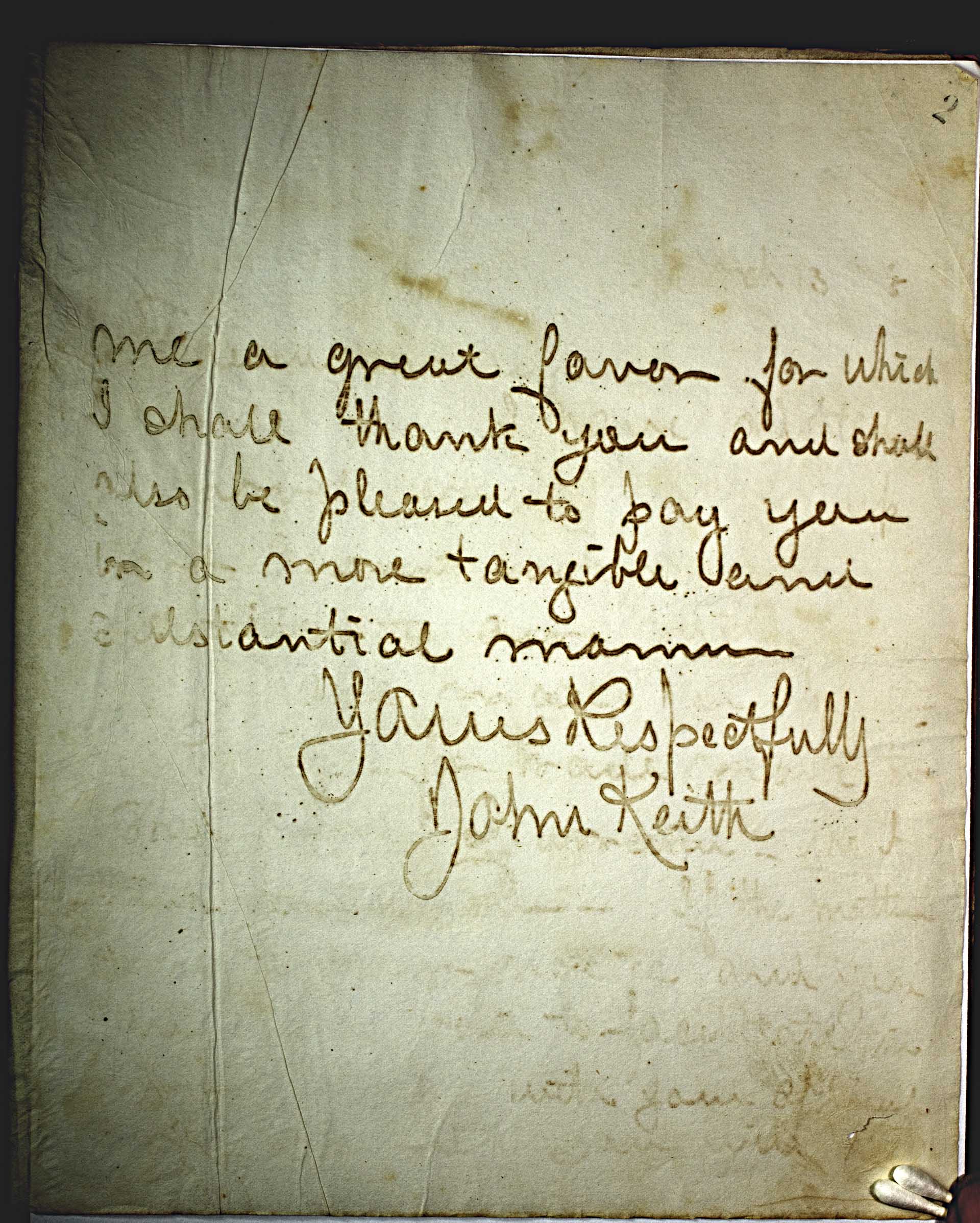 me a great favor for which I shall thank you and shall also be pleased to pay you in a more tangible and substantial manner. -- Yours Respectfully -- John Keith --
