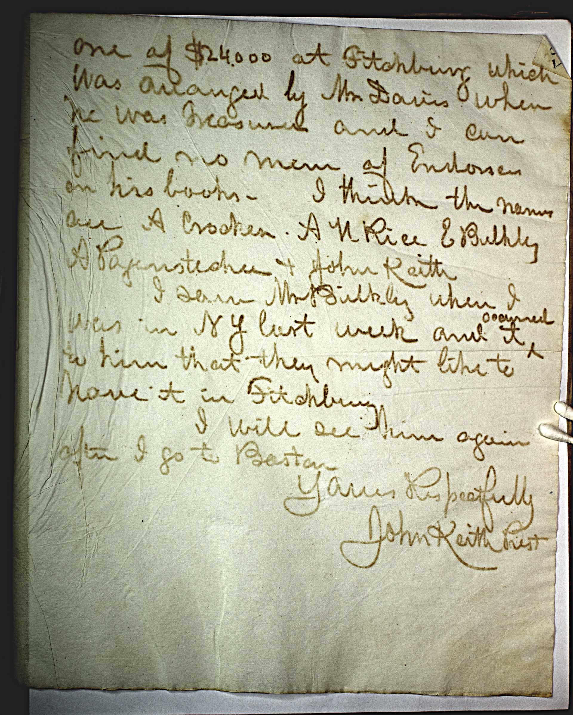 one of $24,000 at Fitchburg which was arranged by Mr. Davis when he was Treasurer and I can find no men of Endorsers on his books. I think the names are A. Crocker, A. Rice, E. Bulkley, A. Pagenstecher & John Keith occurred -- I saw Mr. Bulkley when I was in NY last week and it ^ to him that they might like to have it in Fitchburg. -- Yours Respectfully -- John Keith Prest -- --