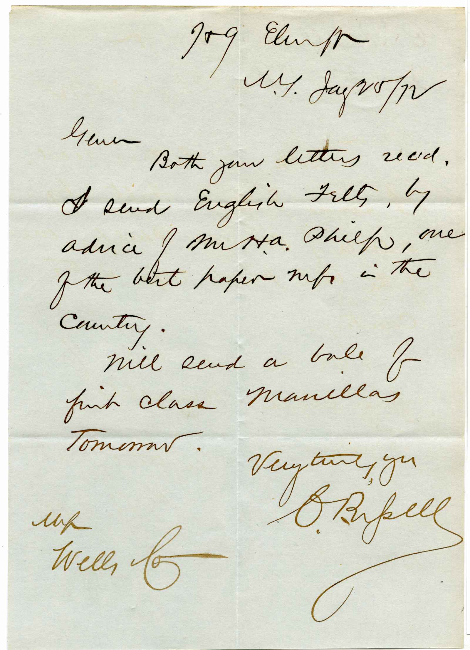 incoming correspondence to the papermaking company of Elisha Wells - circa 1870