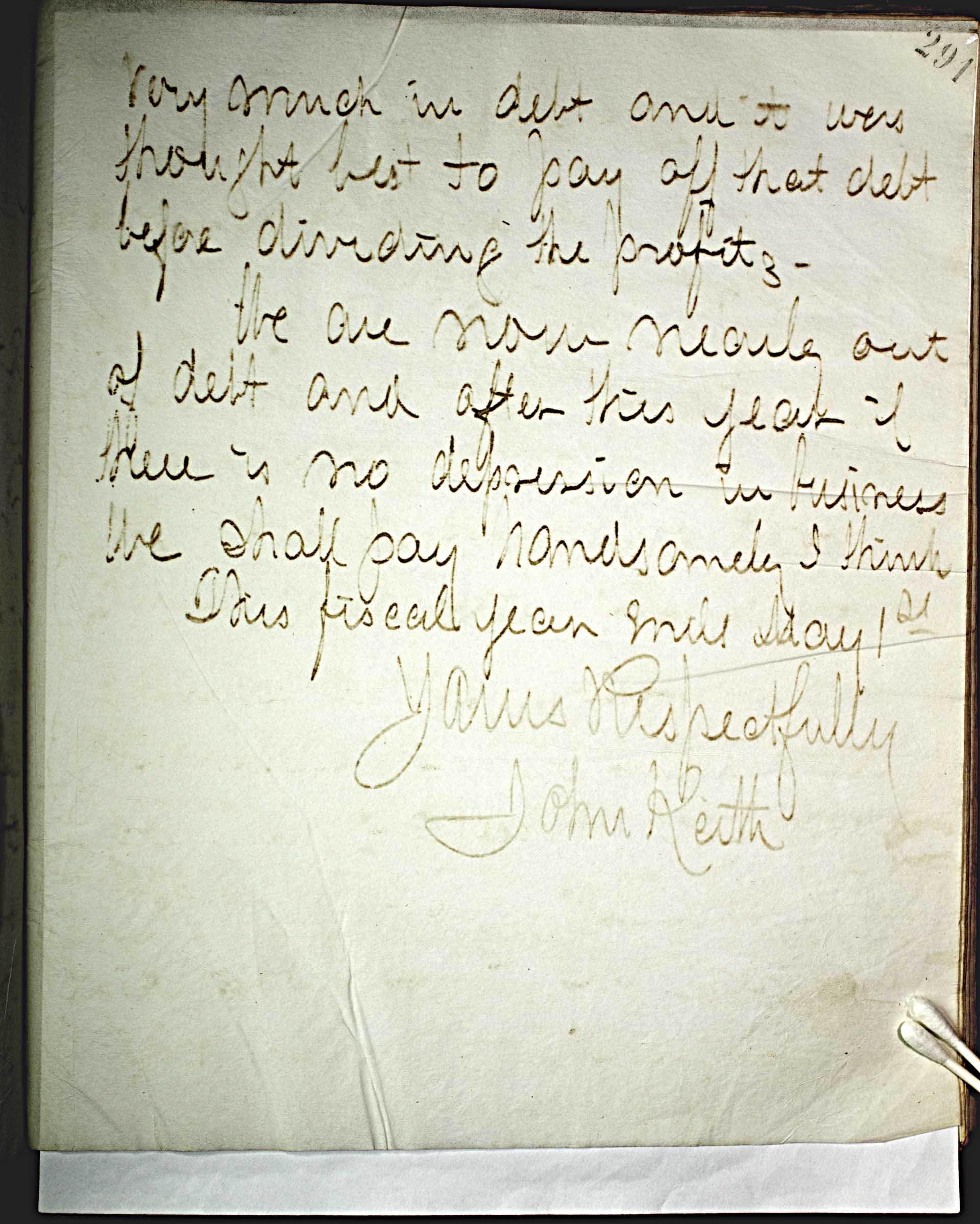very much in debt and it was thought best to pay off that debt before dividing the profits. -- We are now nearly out of debt and after this year if there is no depression in business we shall pay handsomely I think. -- This fiscal year ends May1 -- st -- . -- Yours respectfully -- John Keith --