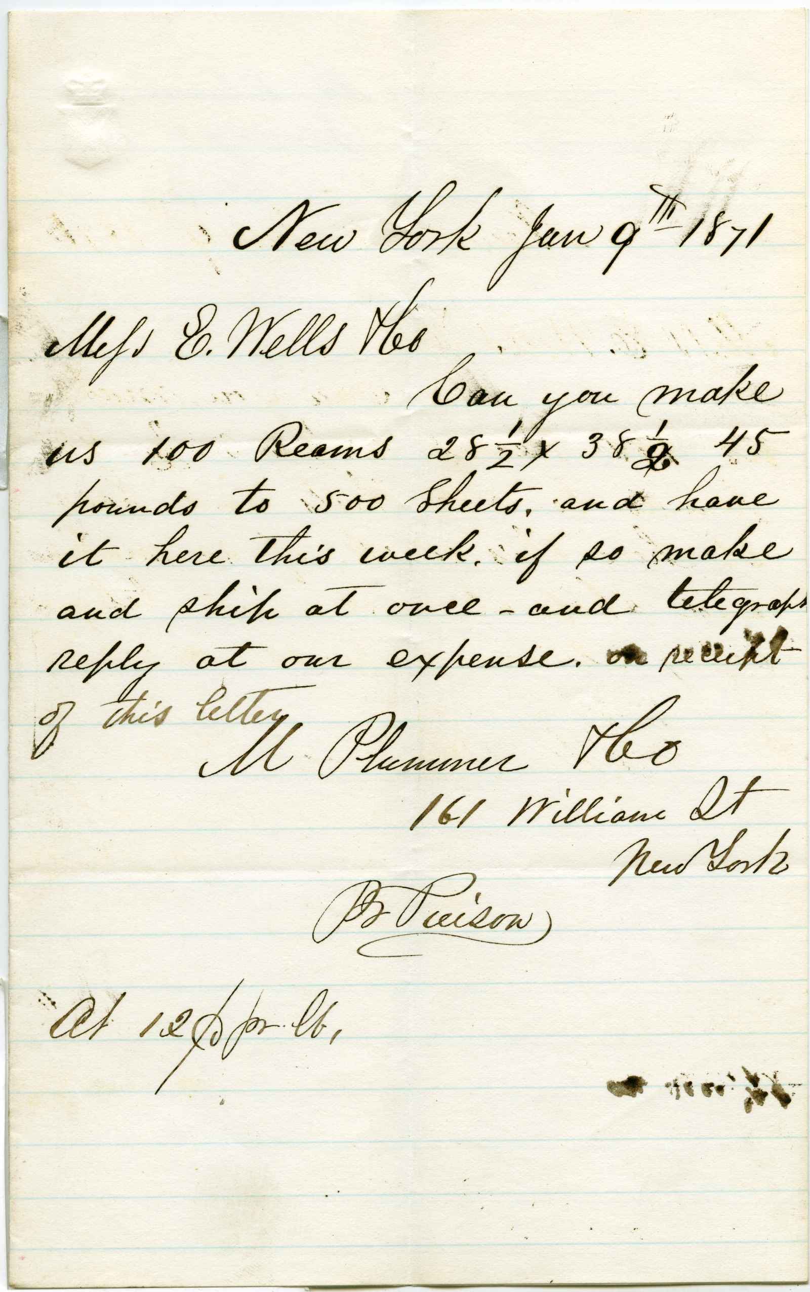 letter; Plummer, M. & Co. - Wholesale & Retail paper Dealers - N.Y.