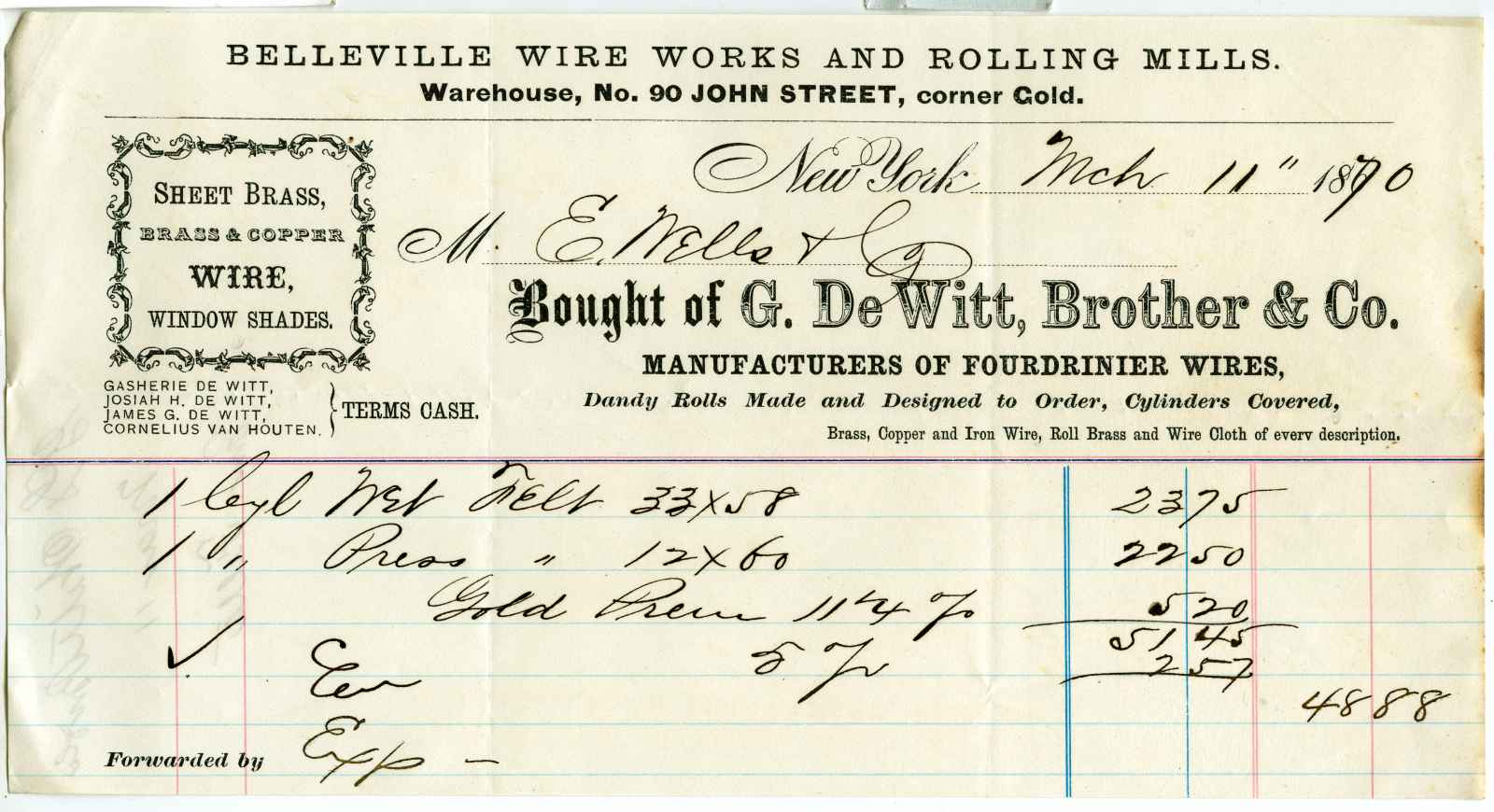 invoice; DeWitt, G., Brother & Co. - Manufacturers of Fourdrinier Wires - N.Y.